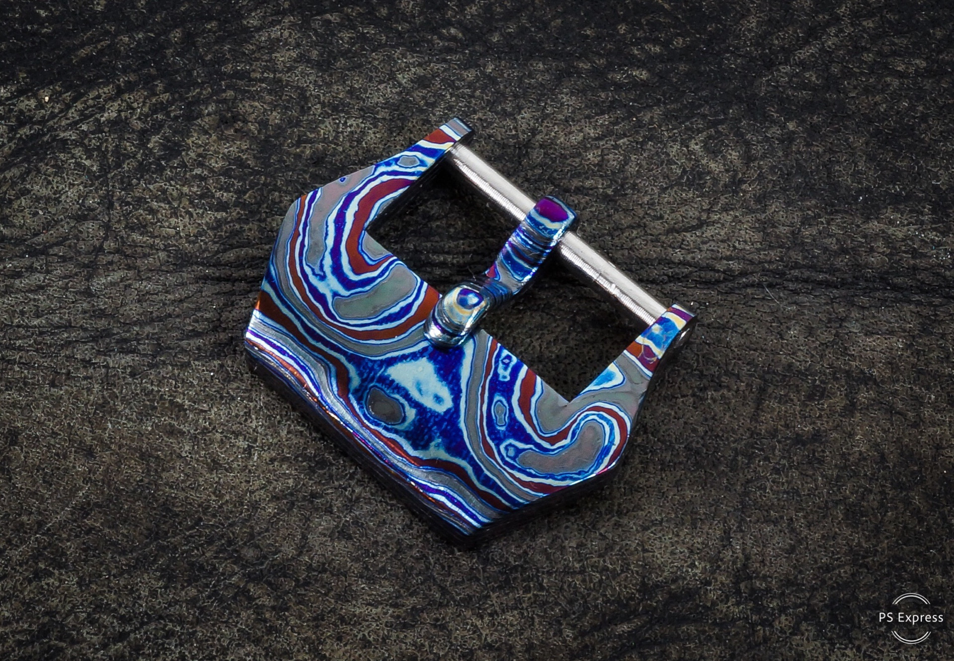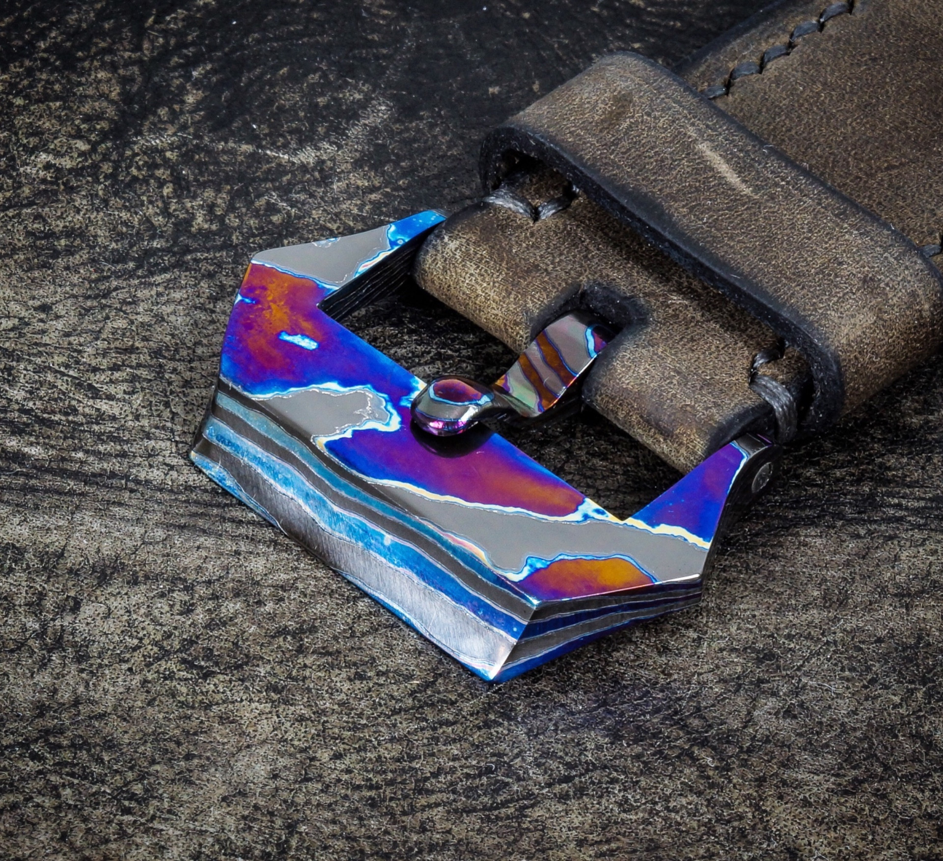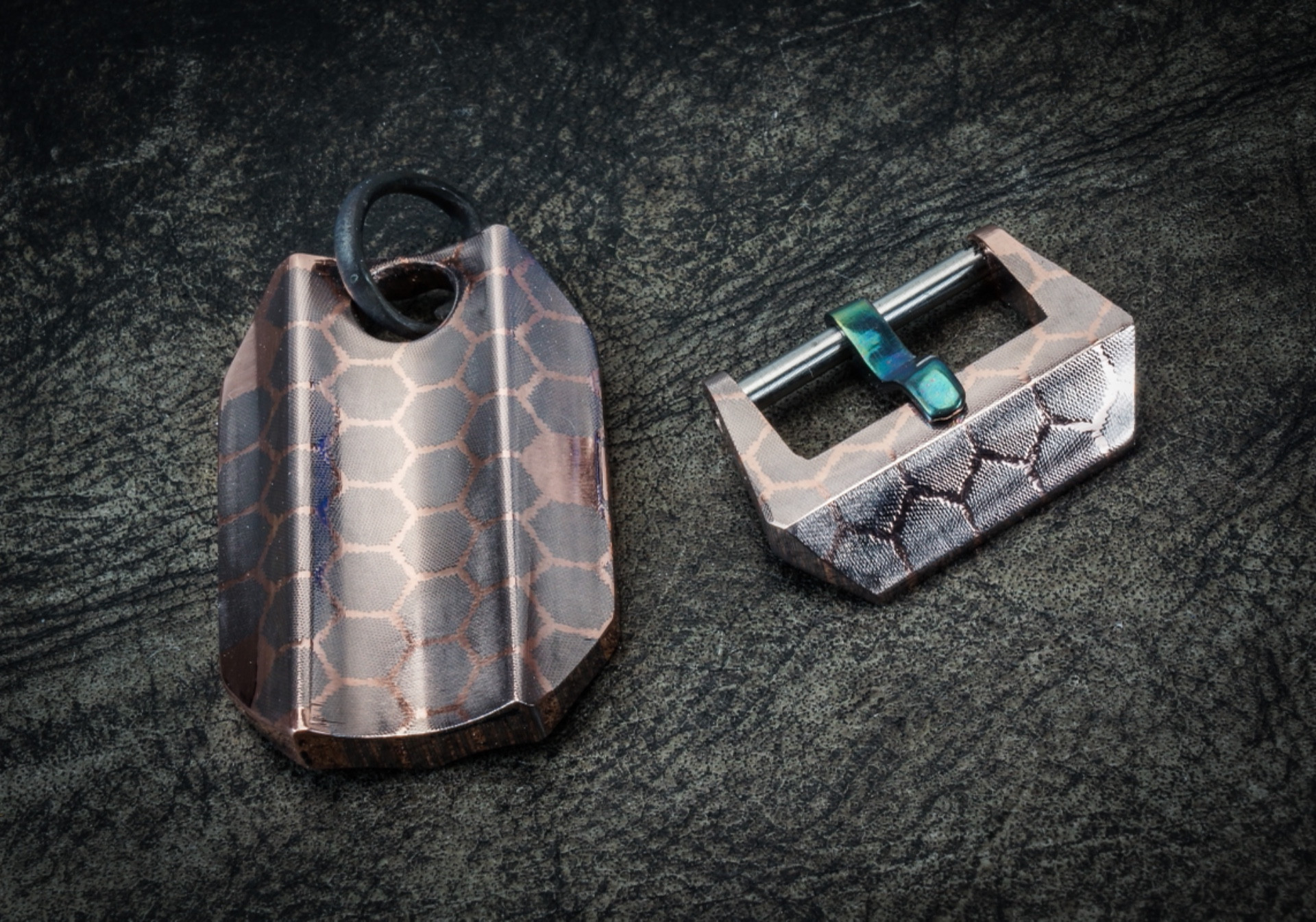 Mokuti is a Blend of 3 alloys of Titanium. It is heat welded and then jig pressed to produce the different patterns. Made by Nichols Damascus