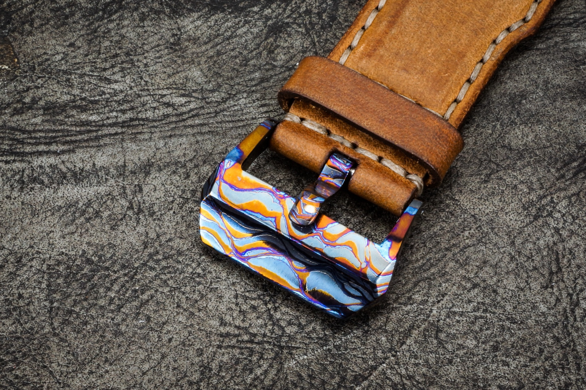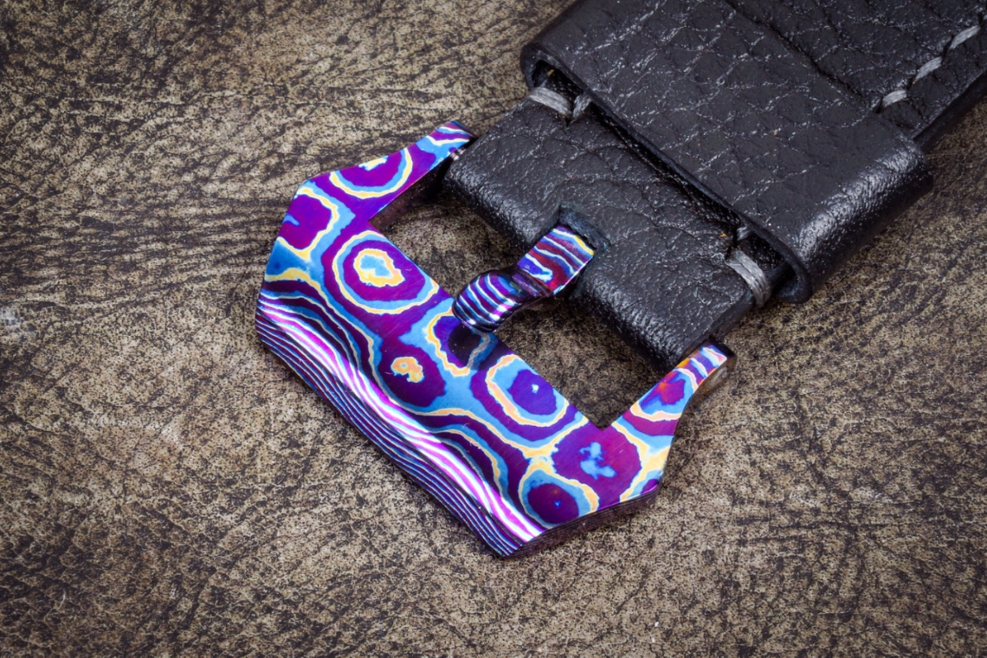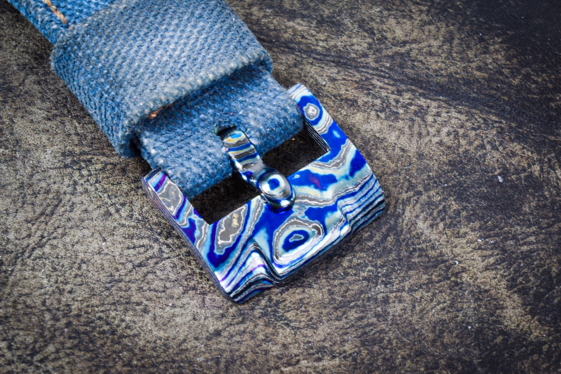 Timascus it a blend of 3 titanium alloys heat welded together then press patterned to produce the different swirls and colors. Made by Alpha Knife Supply
