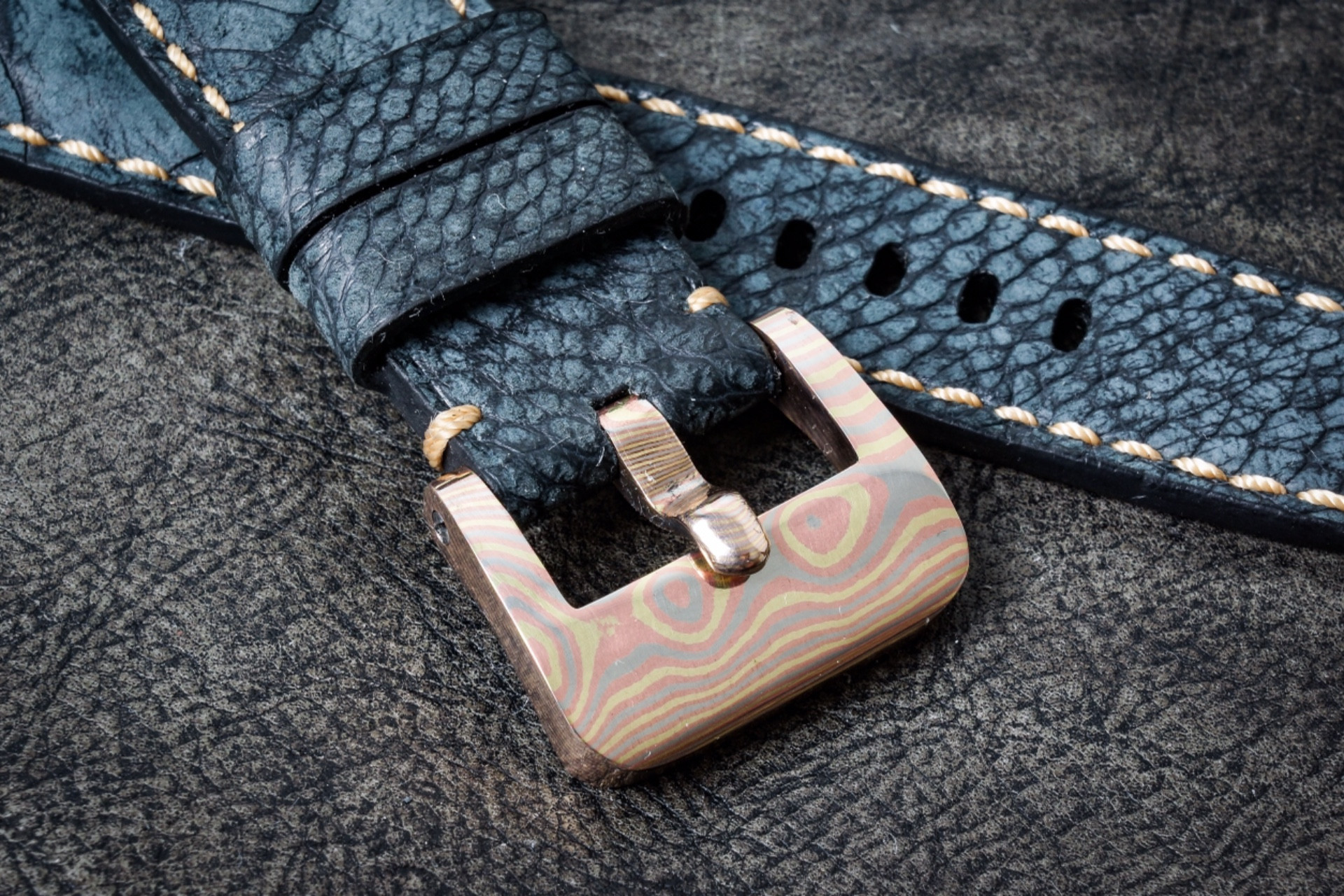 Stainless Damascus is a blend of different steel alloys. It is also heat welded together, jig pressed to produce the patterns. It has to be heat treated and tempered. I use quite a few different makers. This one is Nichols Damascus Ladder pattern on a Belt Buckle.